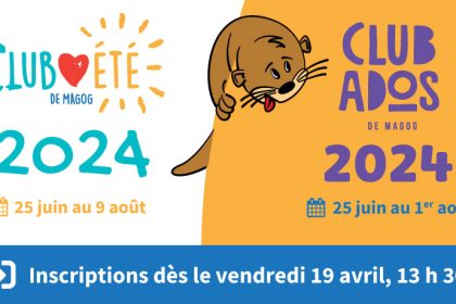 28-03-2024 / La Ville de Magog désire informer la population que la période d’inscription au Club été et au Club ados débutera le vendredi 19 avril à compter de 13 h 30.