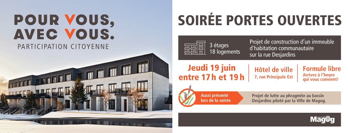 Magog, le 5 juin 2025 – Les citoyens de Magog, particulièrement les voisins du secteur concerné, sont invités à participer à une soirée portes ouvertes concernant un projet de construction sur la rue Desjardins. Un immeuble résidentiel de trois étages totalisant 18 logements abordables et communautaires est proposé. La rencontre d’information aura lieu le jeudi 19 juin, entre 17 h et 19 h, à l’hôtel de ville. Les personnes intéressées à participer doivent s’inscrire en ligne au ville.magog.qc.ca/19juin ou par téléphone au 819 843-3333, poste 336.